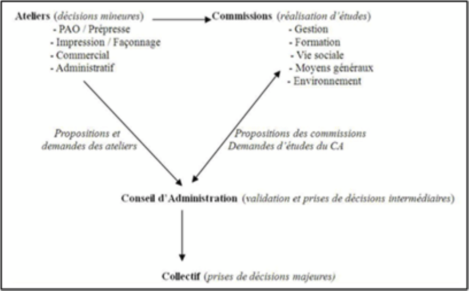 Schéma du système décisionnel au sein de l’entreprise source : Suzy Canivenc, « Evolution et dégénérescence des coopératives autogérées : pour de nouvelles conceptions socio-organisationnelles », Revue internationale de communication sociale et publique, n°5, 2011, p. 37-46