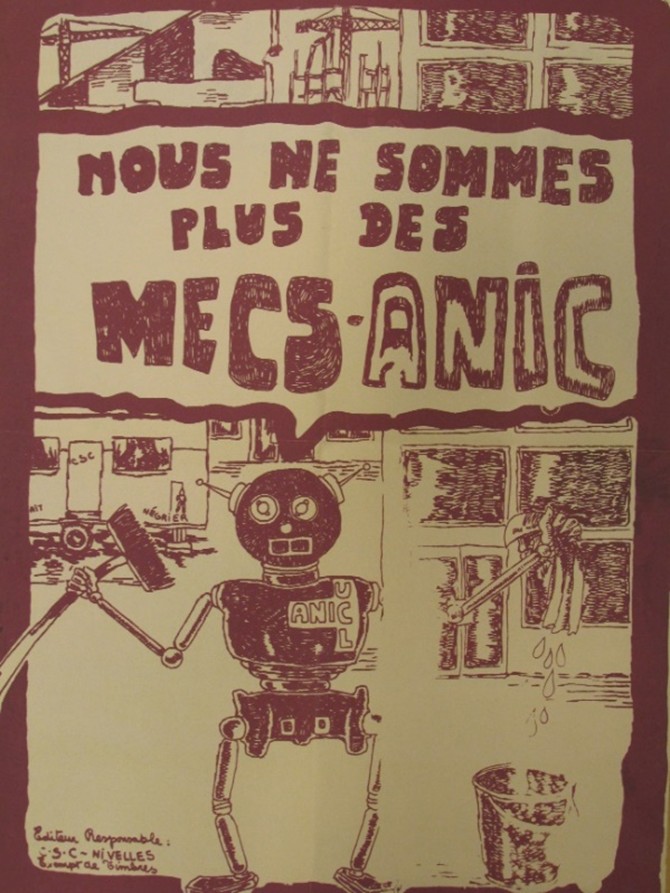[47]« L’organisatrice du travail était la courroie de transmission entre le bureau et les équipes de travail, elle s’assurait que le cahier des charges soit bien rempli, gérait les absences ainsi que les relations avec l’Université et finalement distribuait les produits d’entretien. » [Nicolas Verschueren, « Une utopie ouvrière à l’aube de la société post-industrielle. Le « Balai libéré » et… », art. cit.].