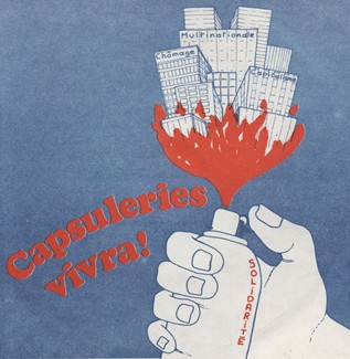 Pochette d’un disque de chants de lutte vendu en soutien aux travailleurs en grève des Capsuleries de Chaudfontaine (1978, Coll. IHOES)