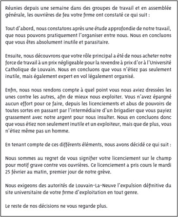 A l’origine de l’affaire, il y a la décision du dirigeant de cette entreprise de nettoyage d’envoyer une partie des travailleuses depuis le site de Louvain-la-Neuve[25] de l’Université catholique de Louvain (UCL) sur Recogne, soit à plus d’une centaine de kilomètres… Ce qui évidemment s’avère en pratique impossible pour celles-ci même au prix de trois heures supplémentaires de trajets quotidiennement – sans moyen de transport prévu – comme le souligne le responsable syndical Raymond Coumont[26], soutien actif de ces travailleuses et à l’origine de ce « courrier de licenciement ». Il faut souligner qu’outre des conditions salariales et de travail pour le moins difficiles, celles-ci « comme la plupart des femmes, en tout cas à cette époque-là, […] devaient se charger de déposer et de récupérer les enfants à l’école, du ménage, du souper pour le mari » cela signifiant qu’il ne leur restait alors qu’à signer leur préavis.