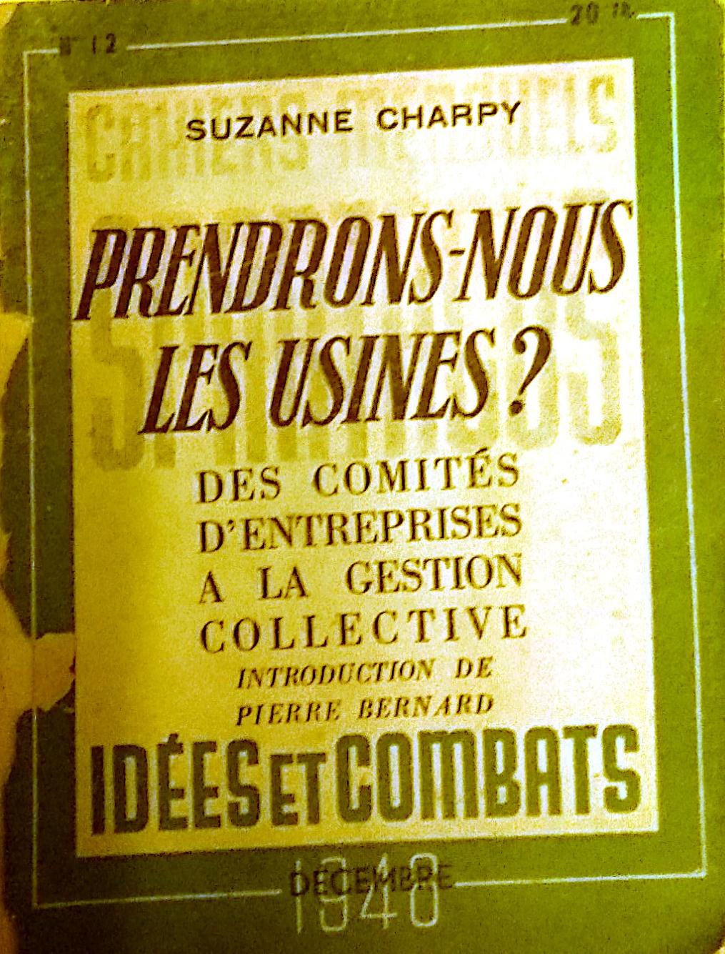 spartacus 46 couvertureNous avions déjà traité des comités de gestion de la Libération à propos de la sortie du livre de Mencherini sur Marseille  (1944, Marseille, l’an I de l’autogestion). Nous continuons aujourd’hui avec Prendrons nous les usines ? édité par les éditions Spartacus en 1948[1]. Cette brochure est constituée en réalité de deux textes, de volume quasiment identique : d’une part celui de Suzanne Charpy apparaissant comme auteur, d’autre part l’introduction de Pierre Bernard intitulée « vers la gestion ouvrière ». Au moment de la parution, nous sommes alors en 1948, les expériences des comités de gestion sont terminées, et les comités d’entreprise sont juridiquement institués. Moment important : s’agit-il d’une continuité, ou d’une sorte de retour à un ordre où le patron récupère le pouvoir de gestion et de direction. Les auteurs sont des praticiens, des militants.